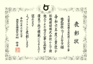 この度、11月7日に開催された「第25回住みよい県土づくり表彰式」において、舩越建設株式会社様と有限会社福岡組様にご推薦いただき、当社初となる「優良下請負業者表彰」を2つの工事でいただきました。